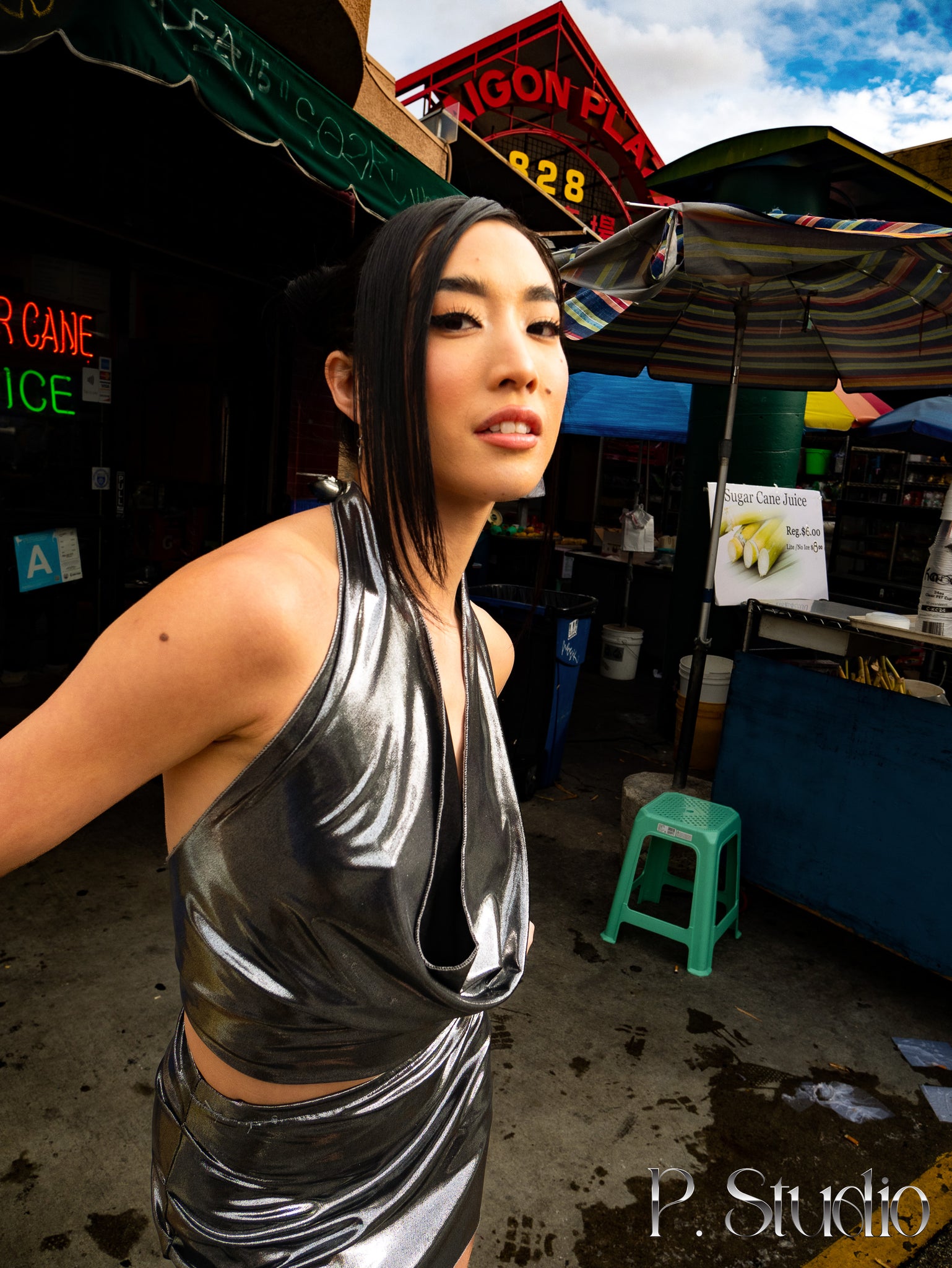 SELENE set includes a cowl neck halter top, with a ruched asymmetrical mini skirt. SELENE skirt is designed with ruching on one side to create an asymmetrical look. The skirt has an elastic waistband. SELENE top and skirt are designed with 4-way stretch material, and designed to fit multiple sizes. Size run: xs-med, med-xl.