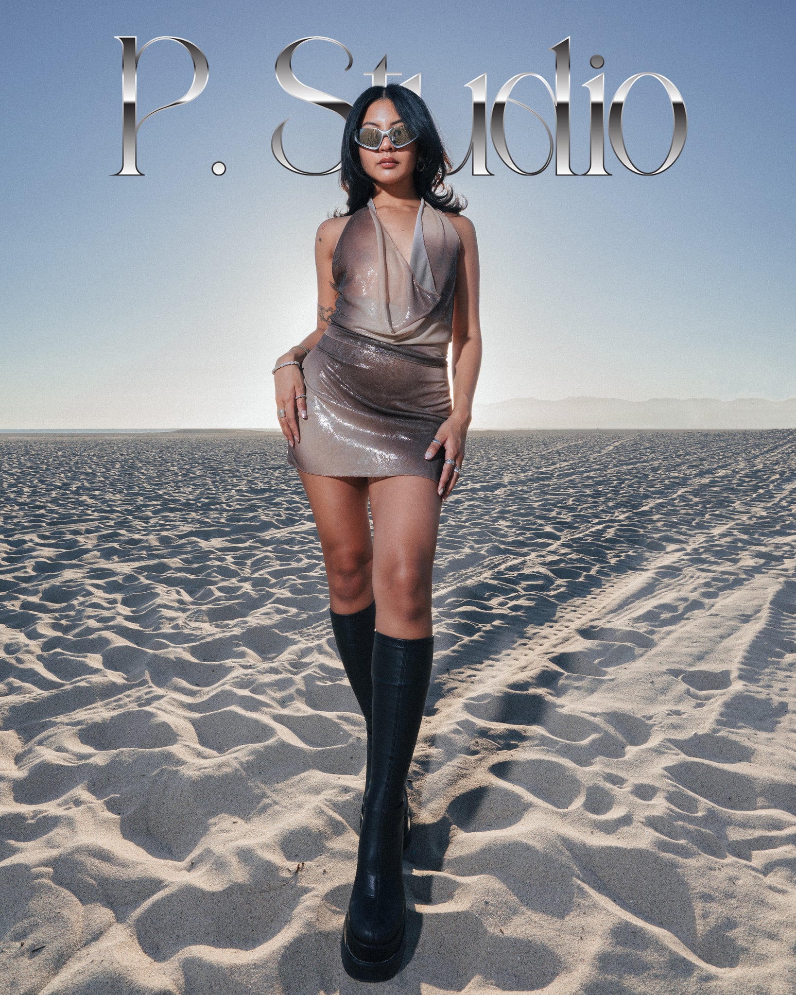 Desert swirl cowl neck set brings out your sultry side, featuring a halter neck cowl neck top, and mini ruched skirt. Designed with a Desert brown Ombré stretch mesh, the fabric has a beautiful silver snake print that adds the perfect amount of shine.