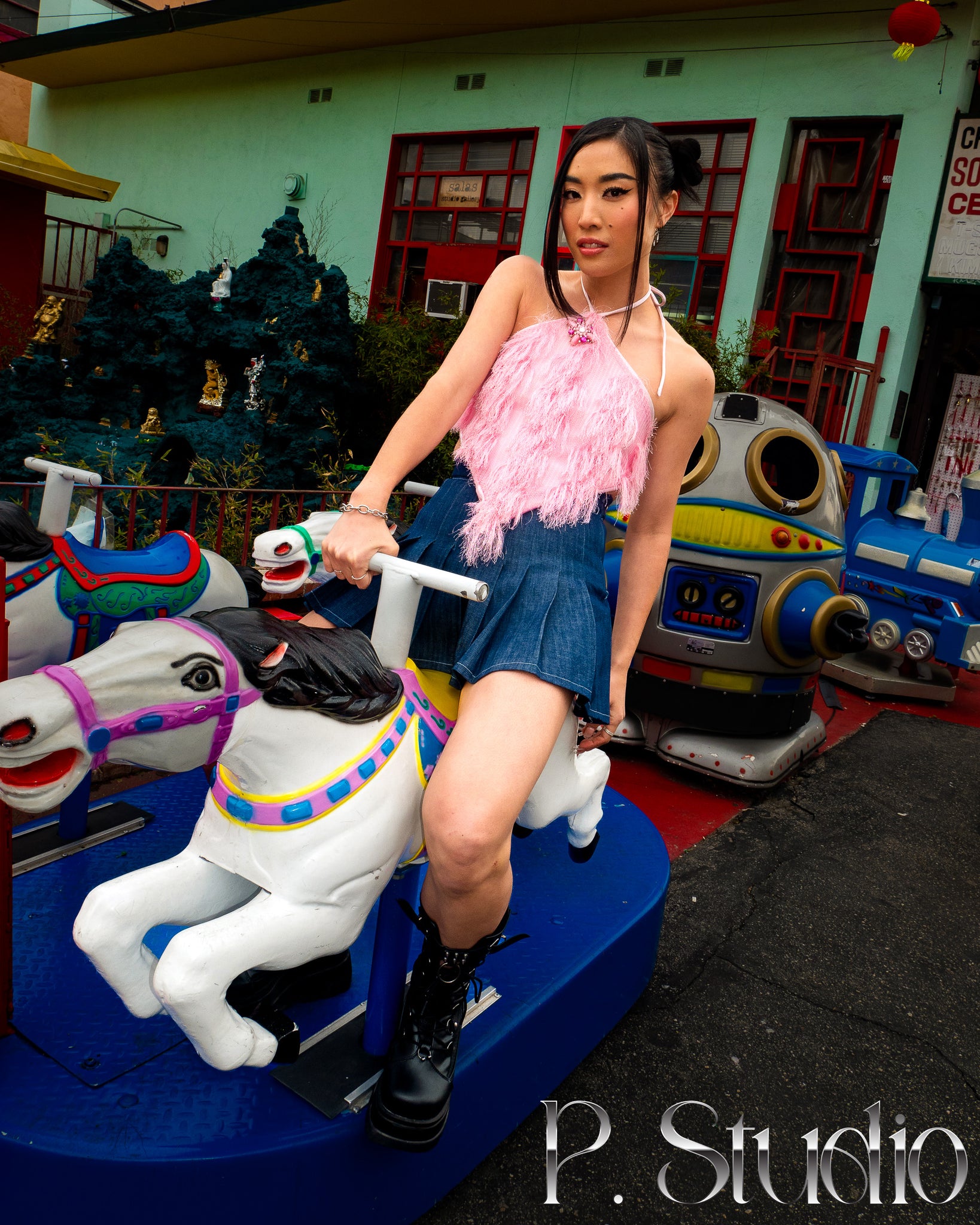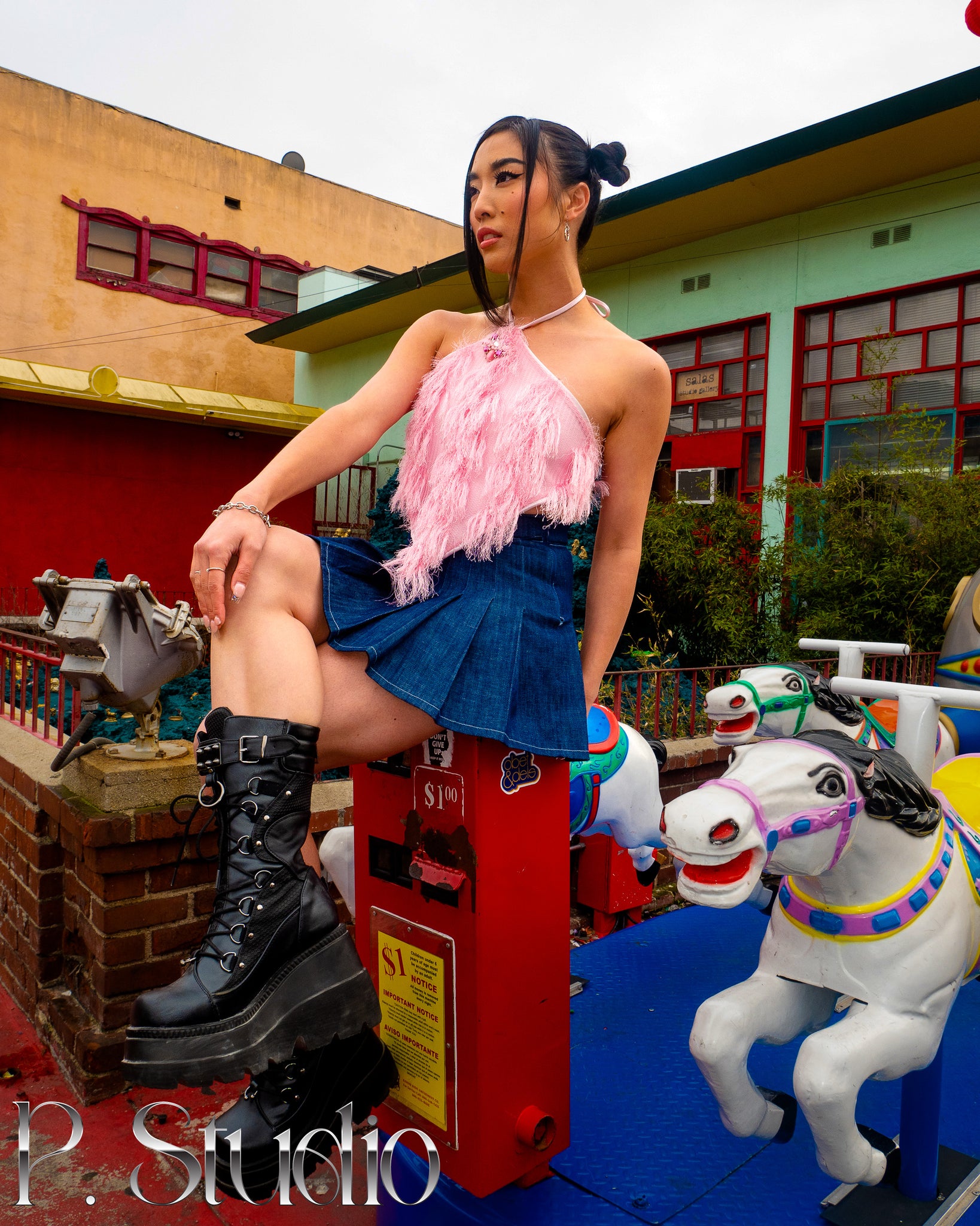 HEBE pink fuzzy halter top, features a removable pink gem brooch at center neck line. Ties around the neck, and ties at the back. HEBE is designed as one size fits all.